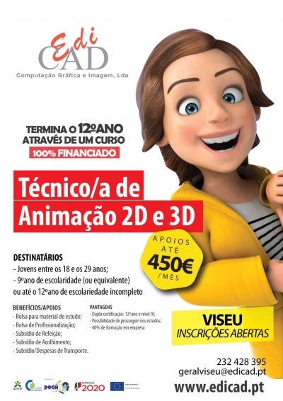 A Edicad abrirá no o curso de aprendizagem e de formação profissional de Técnico/a de Animação 2D e 3D. O curso é dirigido a jovens com idades entre os 18 e os 29 anos, que possuam entre o 9.º ano e o 12.º ano não concluído. Cursos deste género permitem obter uma certificação escolar e profissional, [...]